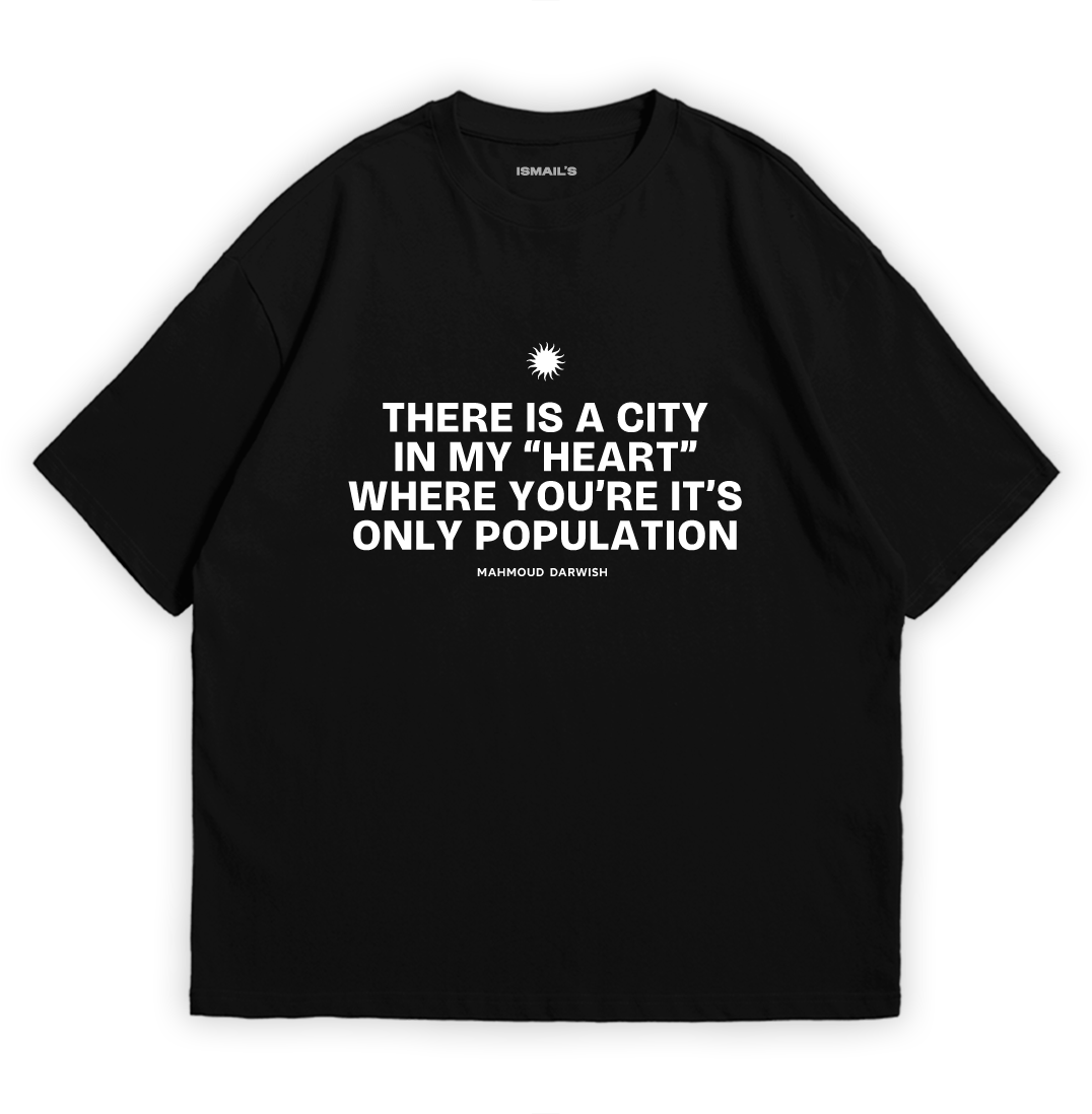 “There is a city in my heart where you’re its only population.” Mahmoud Darwish Quote Inspired T-Shirt by Ismail’s.